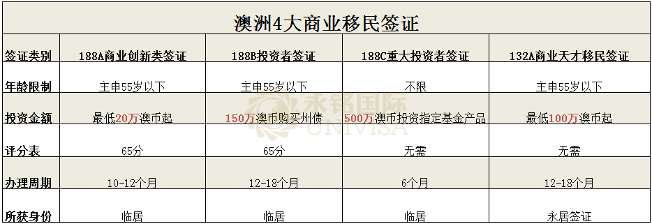 我們先通過下圖簡單了解下澳洲四大商業移民類別:188A商業創新簽證、188B投資者簽證、188C重大投資者簽證和132商業天才簽證。下文我們就這四大商業移民簽證居住要求大起底!