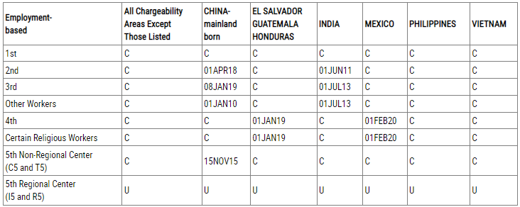 根據(jù)職業(yè)移民排期表B,EB-1、EB-4類別繼續(xù)無(wú)排期,EB-2、EB-3、EB-5類別沒(méi)有前進(jìn),原地踏步。