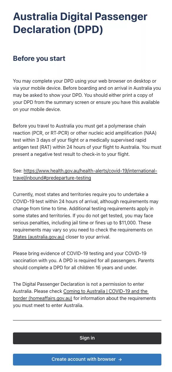 ·聲明已了解入境澳洲和您抵達的州或地區(qū)的檢疫和檢測要求,以及不遵守規(guī)定的處罰。