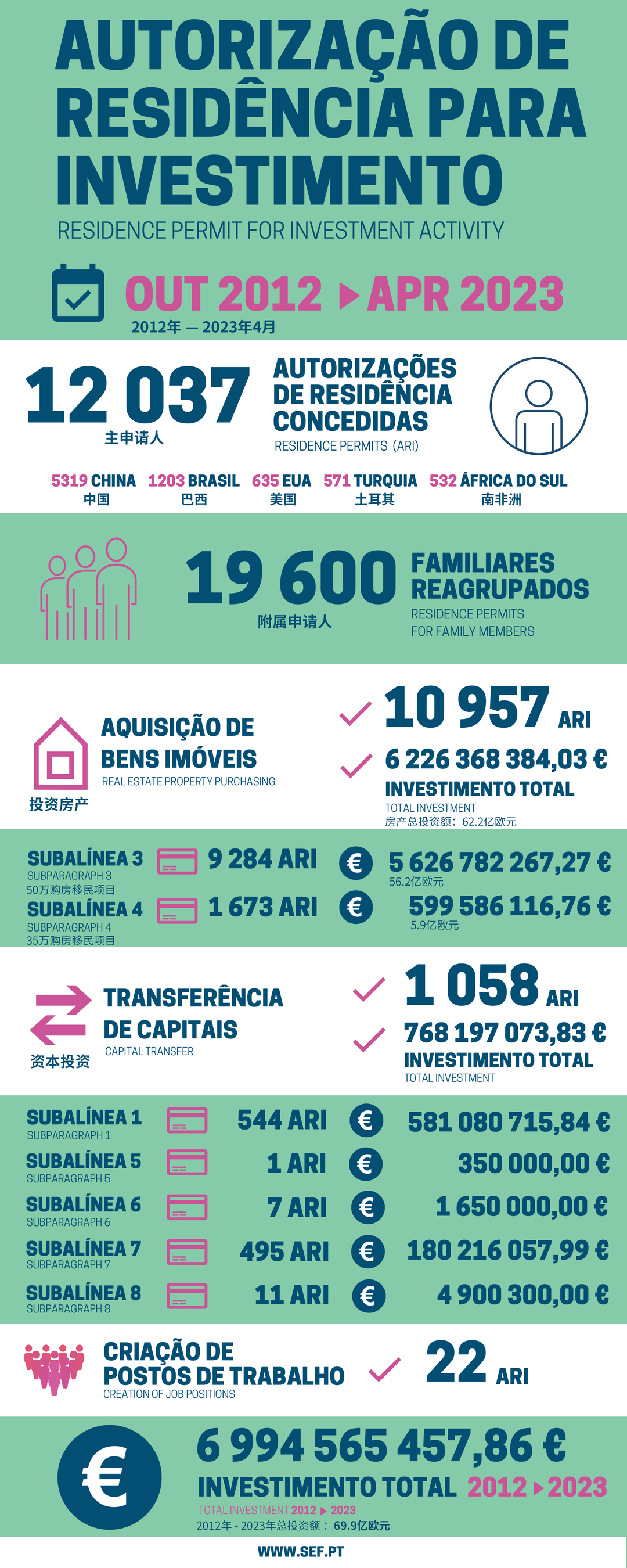 近日,葡萄牙移民局(SEF)正式發布了4月的黃金簽證最新統計數據。4月共有116位主申請人和167位附屬申請人獲批葡萄牙黃金簽證。獲批總人數為283人,總投資額約6327萬歐元。