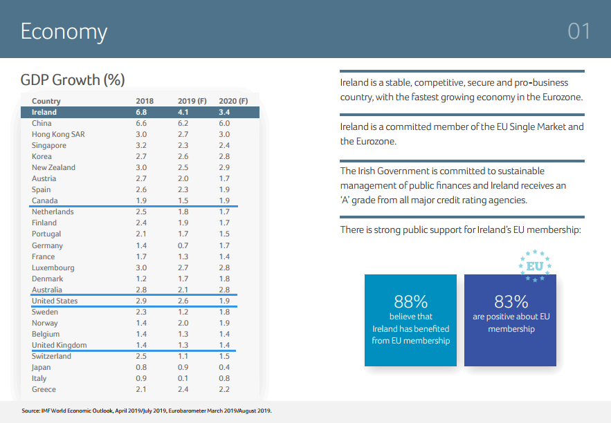 愛爾蘭是一個政治高度穩定、安全、利商、極具競爭力和經濟增速迅猛的西歐國家。據國際貨幣基金組織(IMF)統計,2018年愛爾蘭GDP增速為6.8%,2019年預測增速為4.1%,2020年預測增速為3.4%,遠高于英、美、澳、加等其他英語發達國。此外,愛爾蘭的信用評級被所有主流的評級機構評為優質A級。