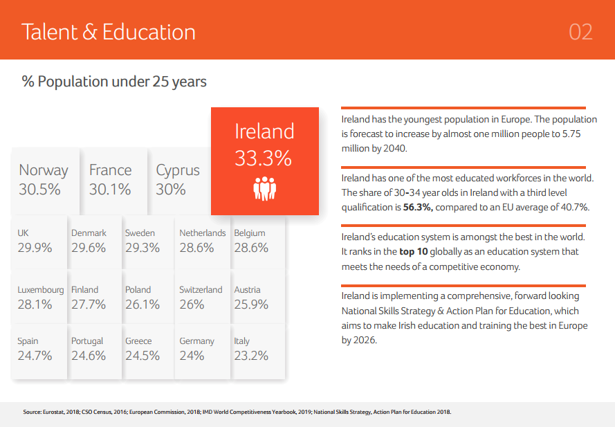 愛爾蘭的確擁有歐洲最年輕的人口,25歲以下群體占愛爾蘭人的1/3。愛爾蘭沿用英式教育,教育系統排名全球前十,近30%學生在科學、技術、工程和數學(STEM)領域深造。愛爾蘭30-34歲的年輕人中有56.3%接受了高等教育,位居歐洲第一。同時,愛爾蘭在吸引和留住國際人才方面排名全球第一。