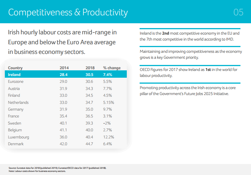 據IMD報告,愛爾蘭是歐盟第二大及全球第七大最具競爭力經濟體。另據經合組織(OECD)報告,愛爾蘭勞動力被列為世界上生產效率最高的勞動力。2011-2017年度IBM全球區域趨勢報告,愛爾蘭更是連續6年蟬聯“吸引全世界高價值項目投資”全球第一。