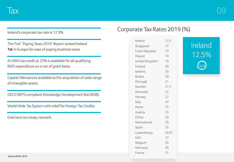 愛爾蘭企業稅率僅12.5%,據PwC發布的“Paying Taxes 2019”報告,愛爾蘭在企業稅收優惠方面,排在歐洲首位。得益于愛爾蘭優惠的稅收政策及利商的經濟環境,在愛爾蘭投資的跨國公司中,有1/3企業已在愛爾蘭開展業務20余年。