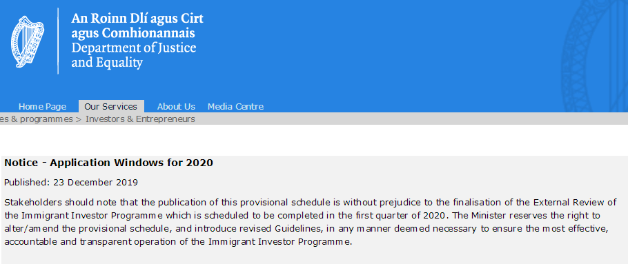 愛爾蘭司法部在12月23日發布通告,公布了2020年愛爾蘭投資移民申請的遞交窗口期及其他相關注意事項。我們將在下文為大家一一解讀。