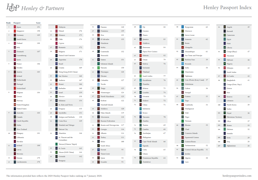 亨氏護照指數是Henley&Partners公司根據國際航空運輸協會(IATA)提供的數據,分析和研究全球國家和地區的護照持有人,在免簽或落地簽的情況下可以入境的國家或地區數量。2020年的排行榜涵蓋了全球199個國家及地區。
