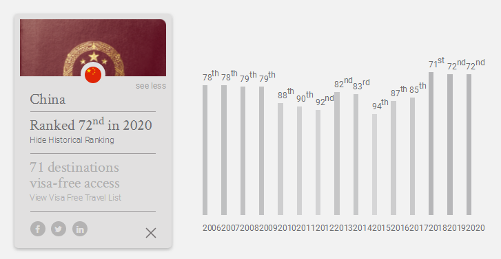 此外,大家非常關注的中國大陸護照,今年和去年一樣排在第72位,有71個免簽/落地簽目的地。中國香港排第20位,免簽/落地簽169個目的地;中國澳門排第34位,免簽/落地簽144個目的地;中國臺灣排第32位,免簽/落地簽146個目的地。