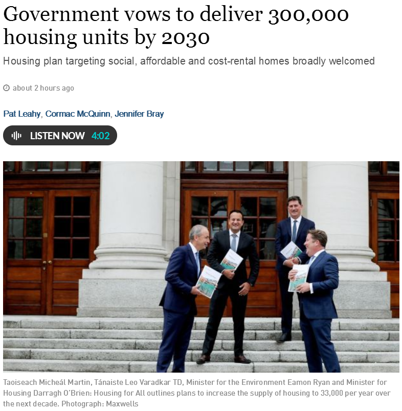 愛爾蘭總理Micheal Martin說,該計劃 "就其范圍、規(guī)模和雄心而言,在我們國家的歷史上是前所未有的"。它將提供有史以來最高水平的政府投資,用于建設政府公屋和經濟適用房。