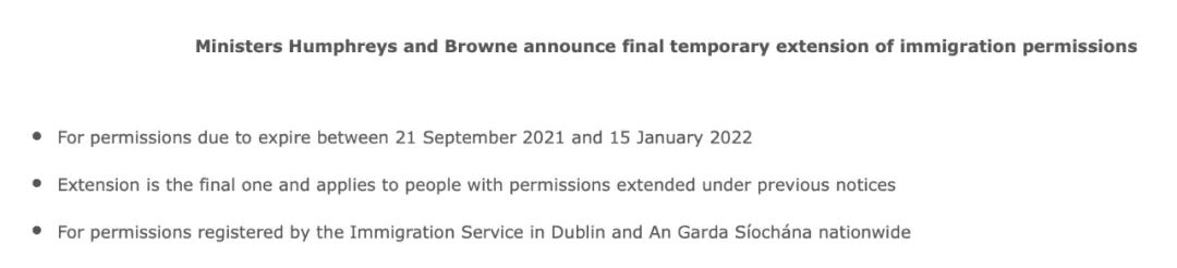 9月14日,愛爾蘭司法部長Heather Humphreys和移民部長James Browne宣布:再次臨時延長簽證許可至2022年1月15日。