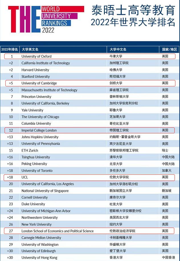 日前,2022年度泰晤士高等教育(THE)世界大學排名出爐,英國牛津大學連續(xù)第六年蟬聯(lián)榜首,劍橋大學與麻省理工學院并列全球第五,英國G5院校(牛津大學、劍橋大學、帝國理工學院、倫敦大學學院和倫敦政治經(jīng)濟學院)全部排名世界前30。毫無疑問,英國高等教育水平始終位居世界頂尖之列。