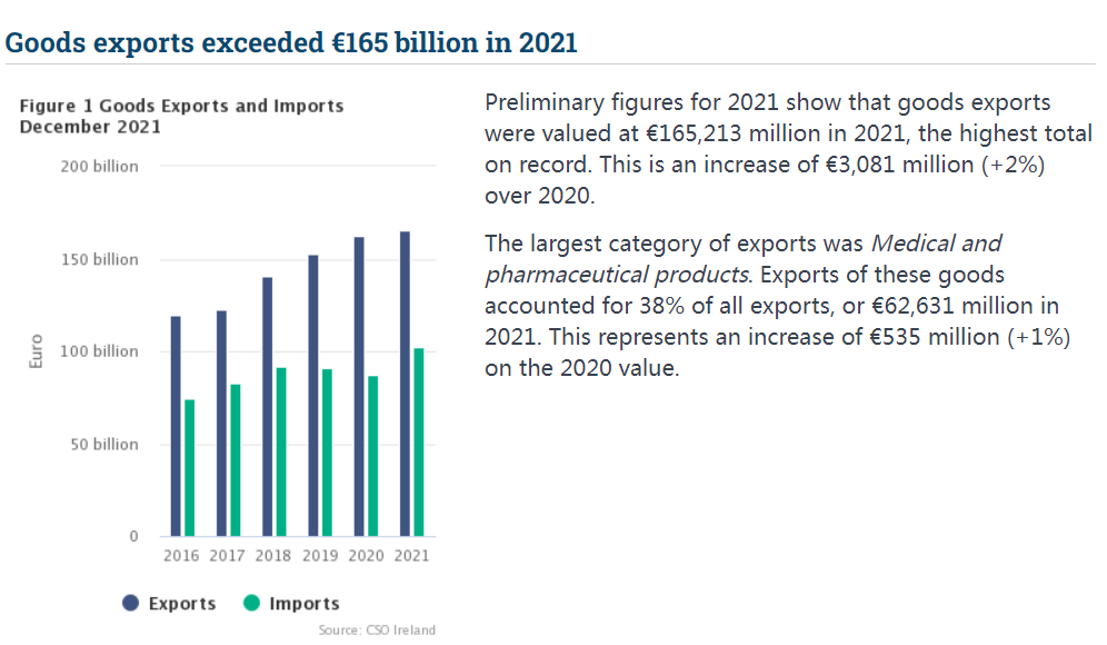 愛爾蘭中央統(tǒng)計局(CSO)最新數據顯示:繼2020年愛爾蘭出口額達到創(chuàng)紀錄的1620億歐元(比2019年增長6.6%)后,2021年愛爾蘭的出口總額又創(chuàng)下新紀錄,達到1652億歐元,同比增長2%。