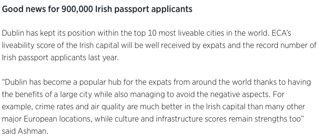 ECA國際分析師Neil Ashman表示:“對于來自世界各地的移民而言,都柏林已經(jīng)成為一個備受歡迎的中心城市,其極低的犯罪率和極高的空氣質(zhì)量遠(yuǎn)遠(yuǎn)優(yōu)于其他歐洲主要城市,同時濃厚的文藝氛圍和優(yōu)良的基礎(chǔ)設(shè)施配套也為它增分不少”。