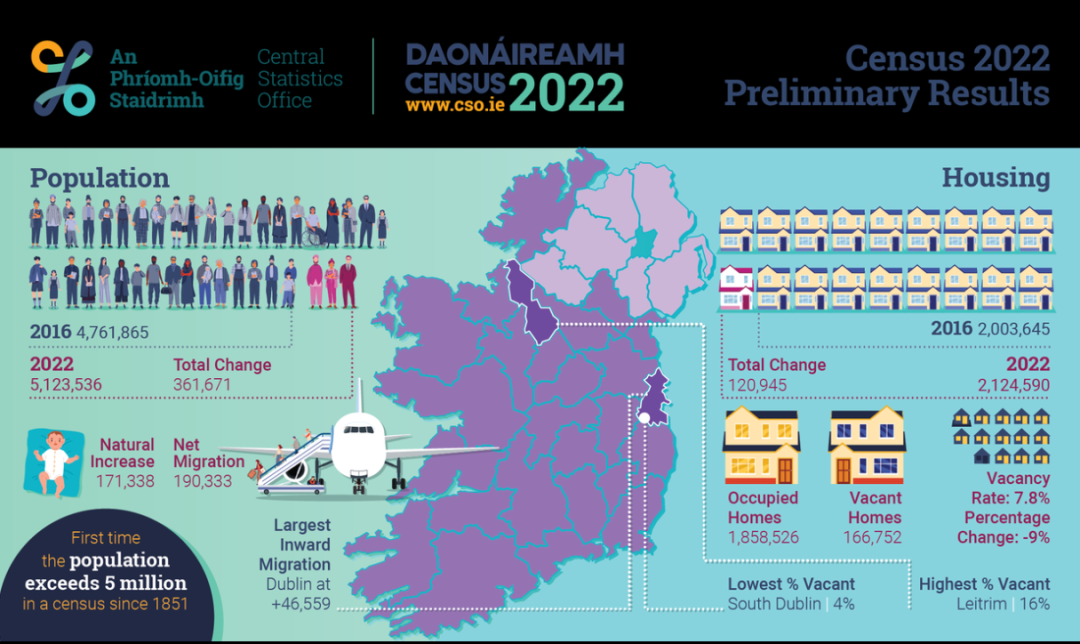 愛爾蘭中央統(tǒng)計局(CSO)6月中旬公布了《2022人口普查報告》初步數(shù)據(jù)。報告顯示:截至2022年4月3日的普查日,愛爾蘭總?cè)丝谠鲩L至512萬3536人,這是自1841年人口普查以來,錄得的最高數(shù)據(jù),也是自1851年以來首次突破500萬大關(guān)。