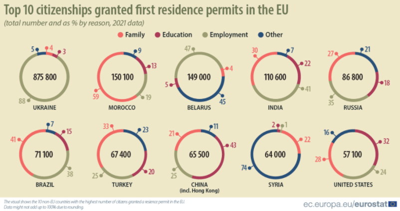 獲得歐盟首次居留許可的前十國家和地區分別是:烏克蘭、摩洛哥、白俄羅斯、印度、俄羅斯、巴西、土耳其、中國(65500張)、敘利亞、美國(57100張)。