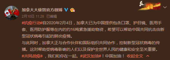 “作為加拿大居民,買不到一個口罩,政府也一直呼吁大家,沒病的人不要戴口罩。原來政府傾盡全國所有(畢竟只有三千多萬人的儲備),把物資都集中起來,送給中國。此時此刻,更加深刻體會加拿大的國家之魂。感恩”