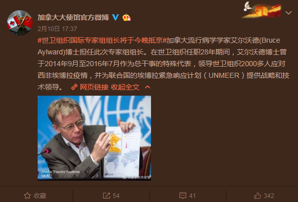 #世衛組織國際專家組組長將于今晚抵京#加拿大流行病學學家艾爾沃德(Bruce Aylward)博士擔任此次專家組組長。在世衛組織任職28年期間,艾爾沃德博士曾于2014年9月至2016年7月作為總干事的特殊代表,領導世衛組織2000多人應對西非埃博拉疫情,并為聯合國的埃博拉緊急響應計劃(UNMEER)提供戰略和技術領導。