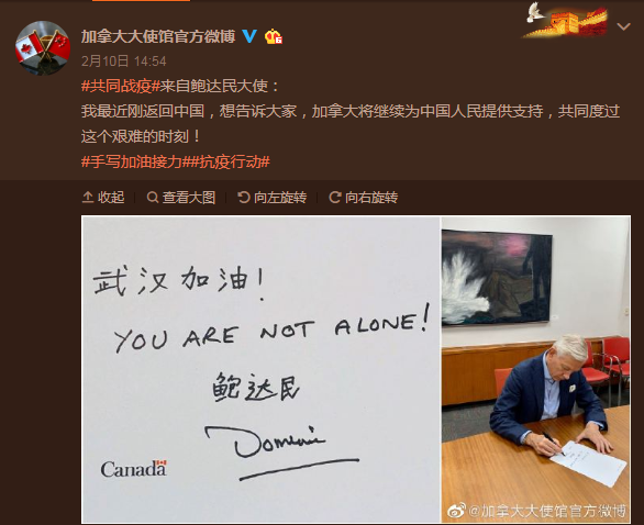 #共同戰疫#來自鮑達民大使:我最近剛返回中國,想告訴大家,加拿大將繼續為中國人民提供支持,共同度過這個艱難的時刻!