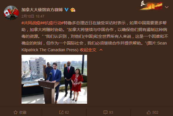 #共同戰疫##抗疫行動#特魯多總理近日在接受采訪時表示,如果中國需要更多幫助,加拿大將隨時協助。“加拿大將繼續與中國合作,以確保他們擁有遏制這種病毒的資源。”“我們認識到,對他們(中國)和全世界所有人來說,這是一個困難和不確定的時刻,但作為一個國際社會,我們必須繼續合作并提供幫助。”