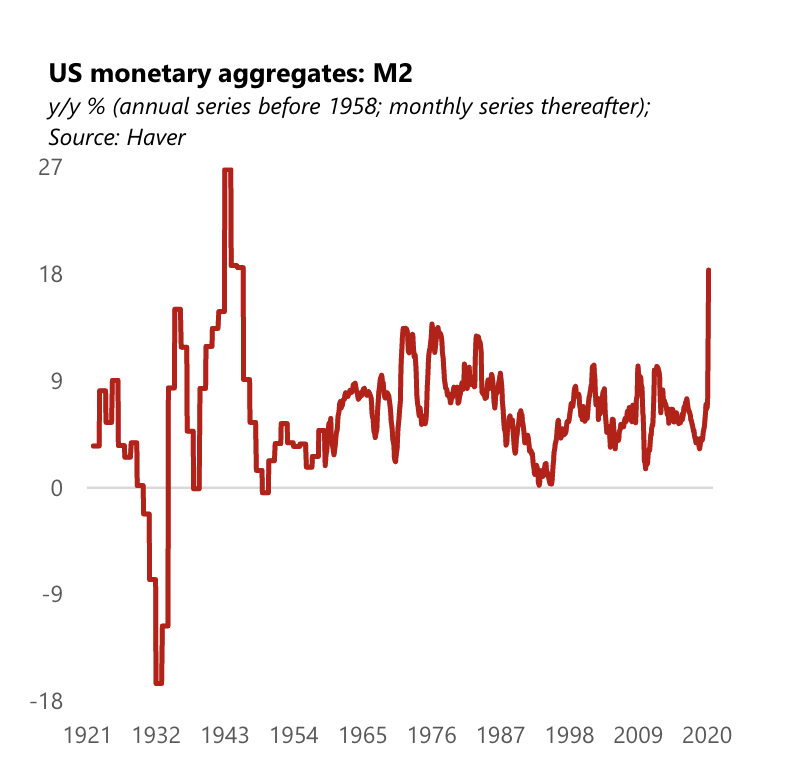 與央行資產(chǎn)負(fù)債表迅速擴(kuò)張相對(duì)應(yīng)的是貨幣總量的急劇膨脹。美聯(lián)儲(chǔ)數(shù)據(jù)顯示,美國(guó)的M2增速已達(dá)到1981年以來(lái)的最高峰,今年的增速有望達(dá)到二戰(zhàn)時(shí)期的最高水平。