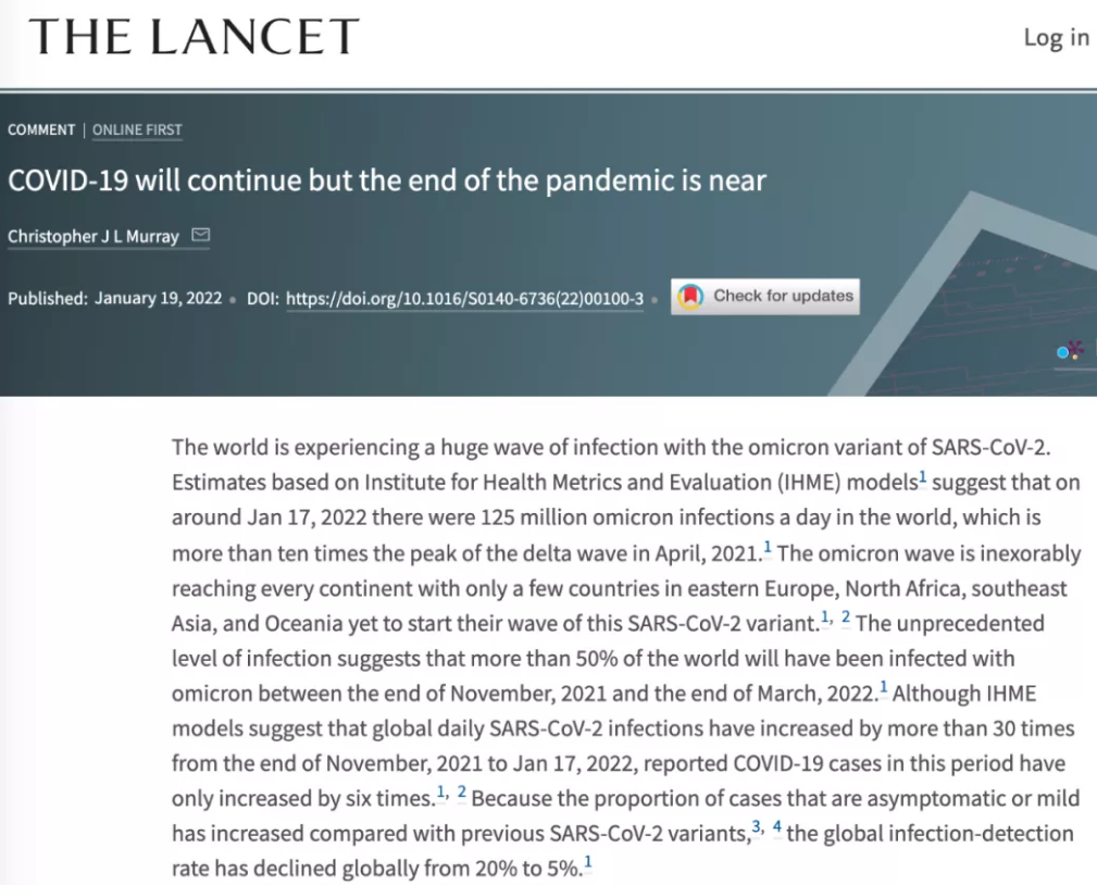 Omicron的肆虐讓大家惶惶不安,疫情已進(jìn)入第三個年頭,大家都翹首盼望著疫情早日終結(jié),回歸正常生活的一天。好在近日,全球最著名的醫(yī)學(xué)雜志之一《柳葉刀》給我們帶來了好消息:大流行即將結(jié)束,關(guān)鍵節(jié)點是3月底。