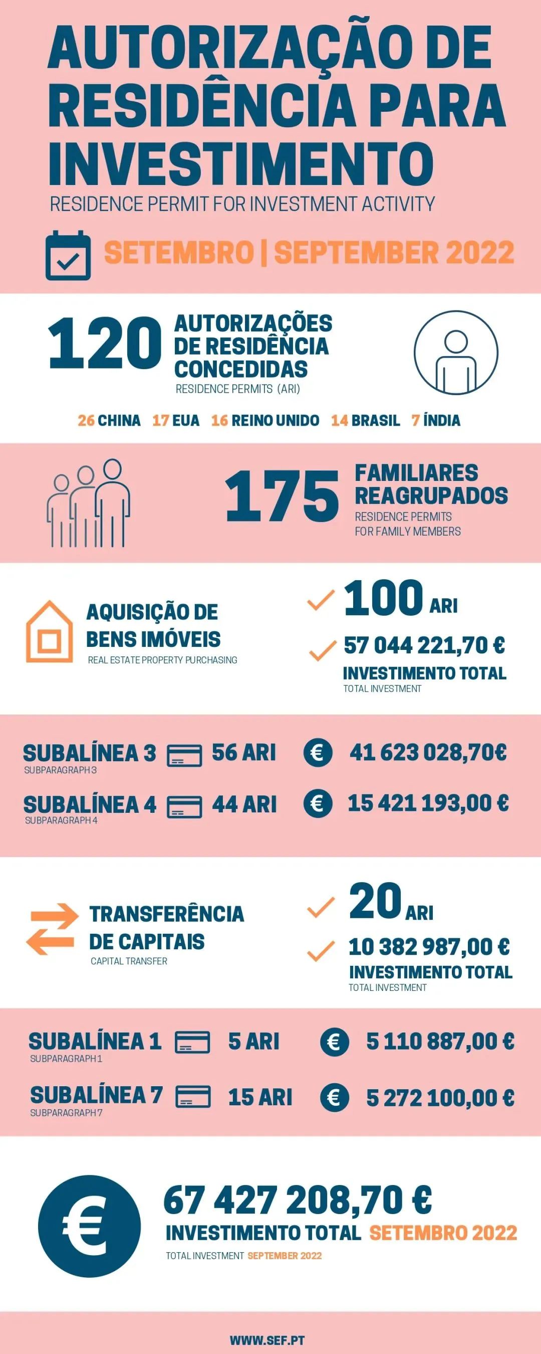 10月8日,葡萄牙移民局發布了9月的黃金簽證審批數據,共有120位主申請人和175位附屬申請人獲批,總投資額約6743萬歐元。2022年前9個月,葡萄牙移民局已經給926戶家庭簽發了黃金簽證,超過了2021年全年的簽發量。