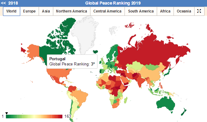 該報(bào)告以社會(huì)安全、國(guó)內(nèi)國(guó)際沖突和軍事化程度為測(cè)量領(lǐng)域,依據(jù)23項(xiàng)定量或定性指標(biāo),對(duì)世界163個(gè)國(guó)家(覆蓋全。球99.7%人口)的和平狀況作出分析與排序。2019排在全球和平指數(shù)前五名的國(guó)家分別是:冰島、新西蘭、葡萄牙、奧地利和丹麥。
