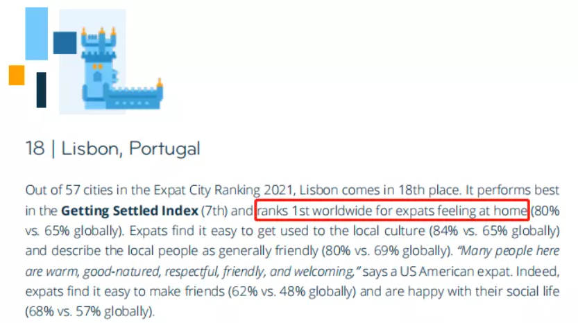 根據InterNations最新榜單,來自世界各地的受調外籍人士中,80%認為里斯本給他/她們像家一樣的感覺,遠遠超過全球平均水平65%,穩居最有歸屬感城市第一名!