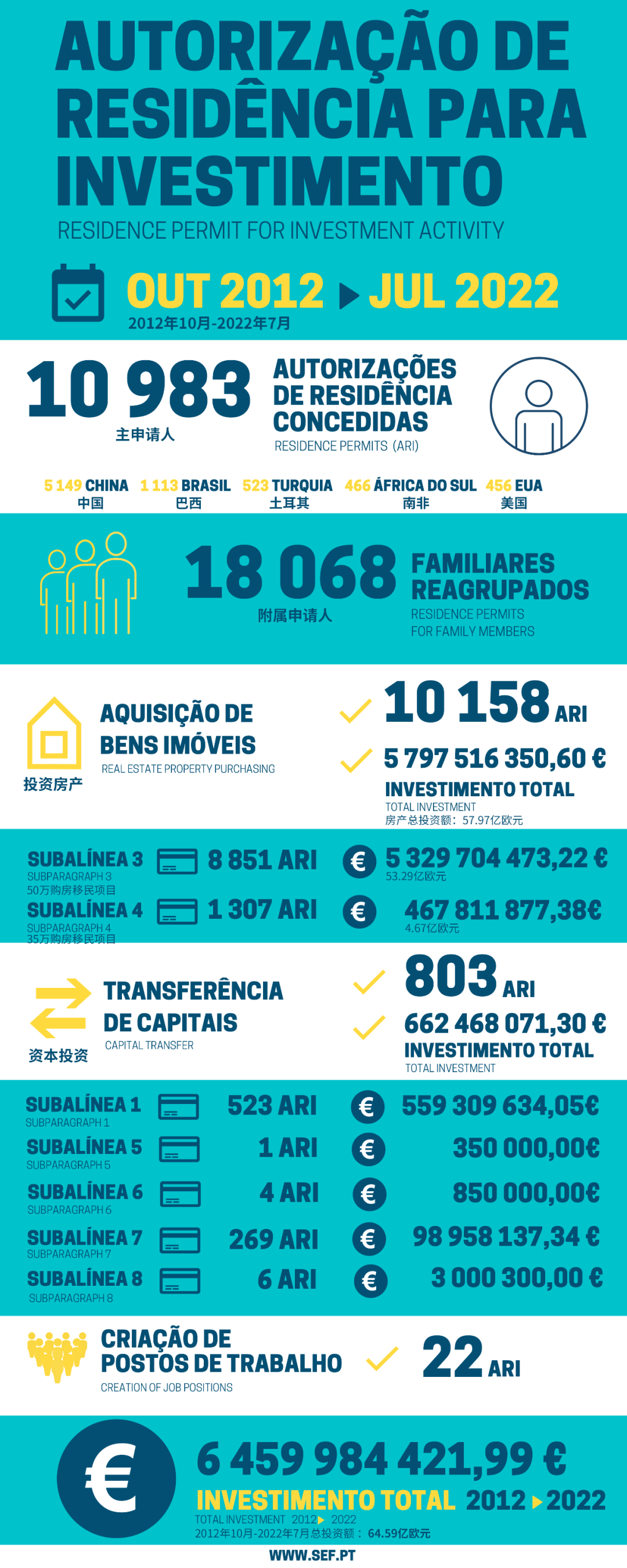 不知不覺間,葡萄牙黃金簽證項目已推出10年,自2012年10月葡萄牙黃金簽證政策出臺以來,截至2022年7月底,全球已有10983位主申請人獲批葡萄牙黃金簽證,獲批附屬申請人18086位,為葡萄牙總計吸金高達64.6億歐元。其中,獲批中國家庭高達5149個,占比近5成。