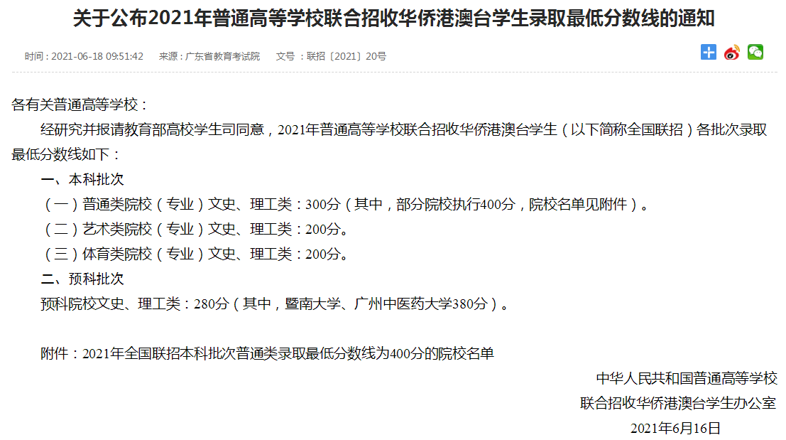 根據(jù)《2021年普通高等學校聯(lián)合招收華僑港澳臺學生錄取最低分數(shù)線》的通知,各批次錄取最低分數(shù)線如下: