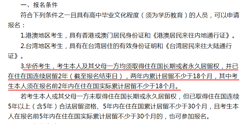 考生本人及其父母一方均須取得住在國長期或者永久居留權(quán),并已在住在國連續(xù)居留2年(截止報名結(jié)束日),2年內(nèi)累計居留不少于18個月,其中考生本人須在報名前2年內(nèi)在住在國實際累計居留不少于18個月。